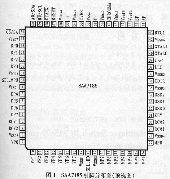 SAA7185的引脚排列如图1(顶视图)所示。它采用PLCC68封装。各引脚的功能及说明如表1所列。