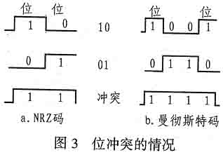 非法编码判断和编码方式的相关资料可参见参考文献。下面主要介绍NRZ码和曼彻斯特码在发生冲突时合成波形的变化情况。从图3中可见,NRZ 码无法判断位0和位1的冲突,因为冲突后的结果可认为正常的数位1。而曼彻斯特编码的数位1,如果以速率高一倍的NRZ码10来表示,其数位0则可表示为01,其数位1和数位0冲突的结果则可表示为11,而曼彻斯特码中,11是非法编码,故而极易判断位冲突出现。TYPE A中就是采用了曼彻斯特编码。当然,图3所示情况是基于位时间同步和放大限幅的环境,在RFID中,这些都是可以做到的。